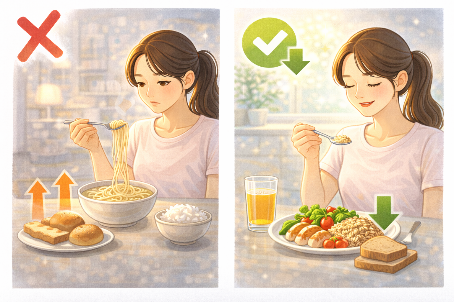 한꺼번에 극단적으로 줄이지 말고, 밥 한 숟가락 줄이기부터 시작하세요. 백미를 잡곡으로 바꾸는 것부터 시작하세요. 작은 변화가 모여 체중, 혈당, 에너지가 달라집니다.