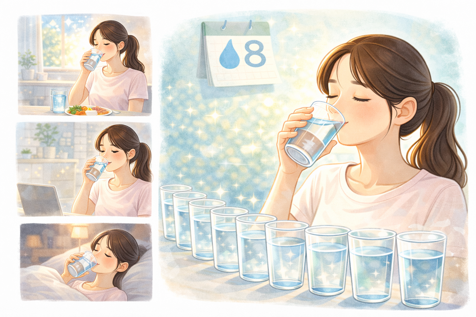 "하루 8잔"이 어렵게 느껴지면, 지금 하루 4잔도 안 마시고 있기 때문입니다. 오늘 1잔 더, 내일 1잔 더... 일주일이면 8잔이 자연스러워집니다.