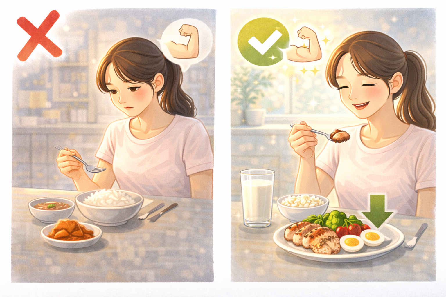 오늘부터 시작할 첫 걸음: 내일 아침 식사에 계란 1-2개를 추가하세요. 또는 우유 한 잔, 요거트 한 개. 아침 단백질이 하루 식욕과 에너지를 바꿉니다.
