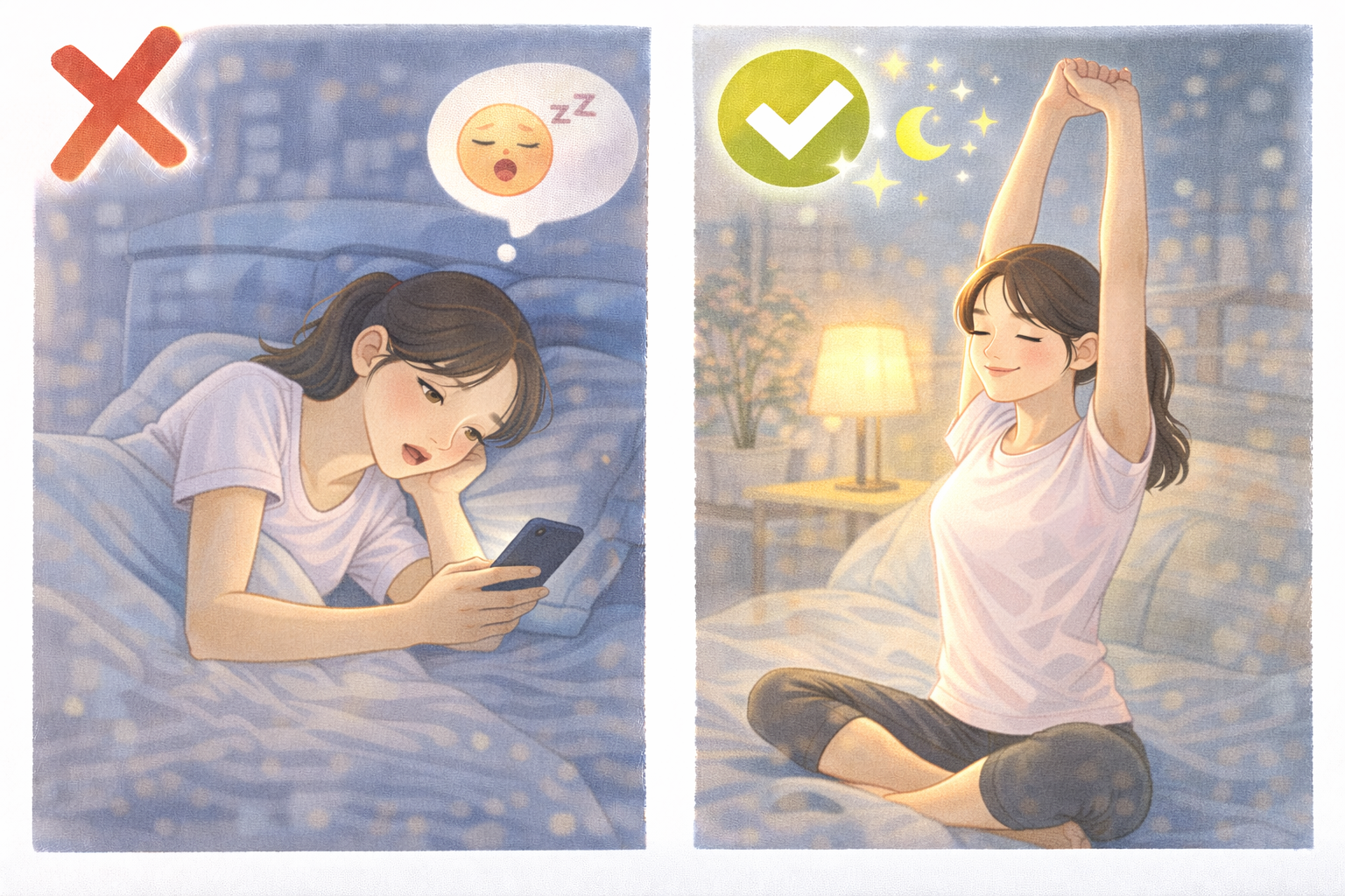 스트레칭 후 핸드폰 보지 말고 바로 불 끄고 누우세요. 이완 상태를 유지한 채 잠드는 게 핵심입니다.