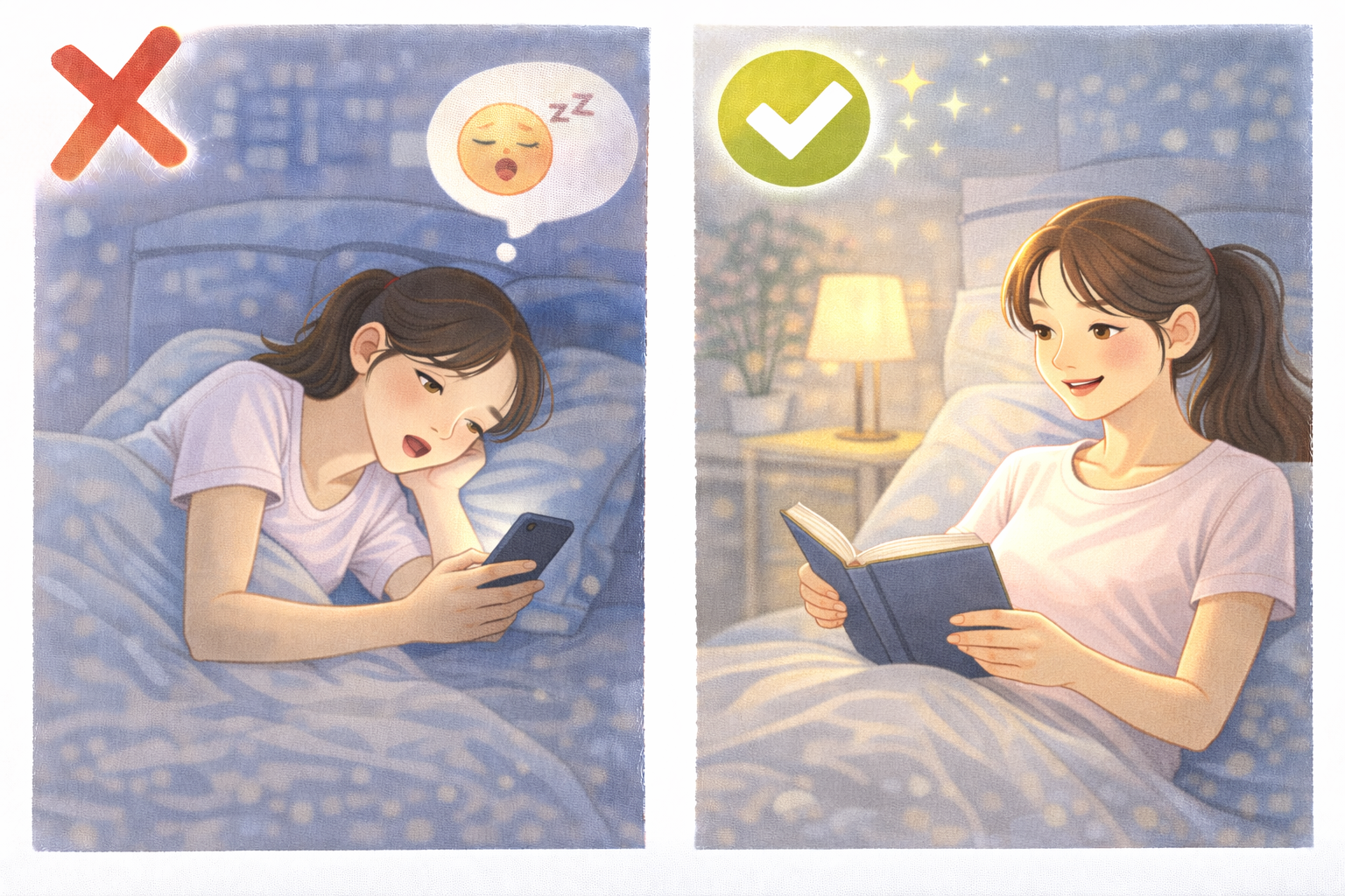 블루라이트가 멜라토닌을 억제합니다. 종이책 또는 e-ink 리더(킨들 페이퍼화이트 등)를 사용하세요.